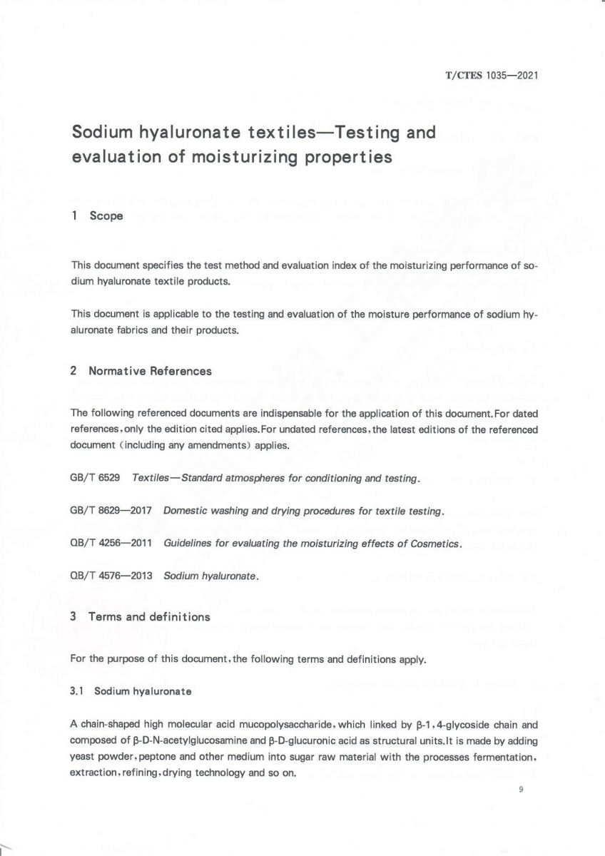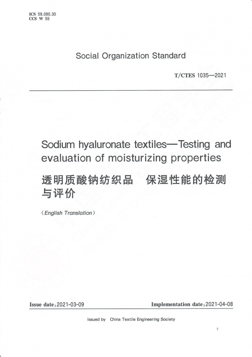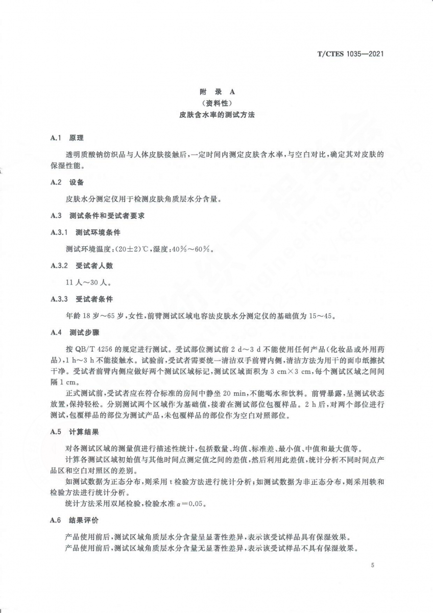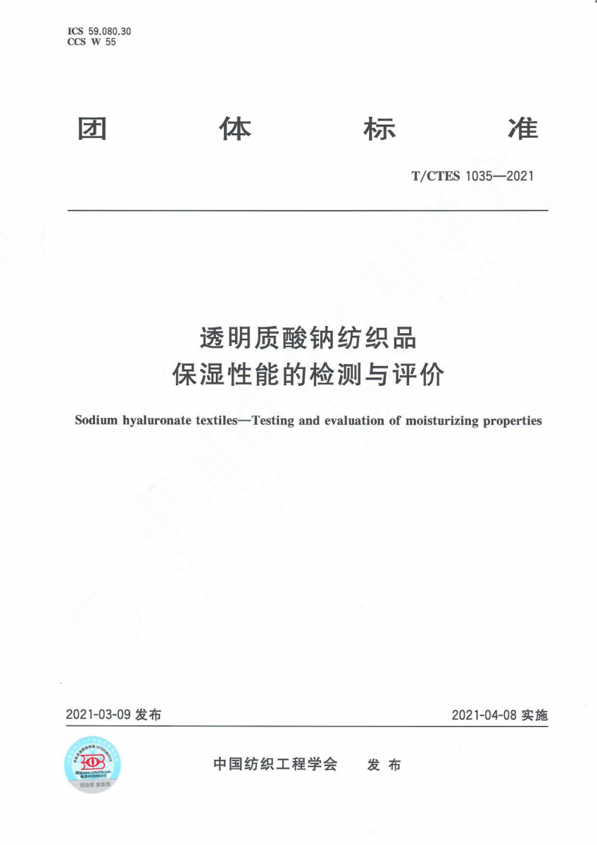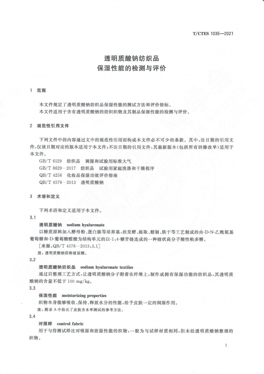 T/CTES 1035-2021 透明質酸鈉紡織品 保濕性能的檢測與評價