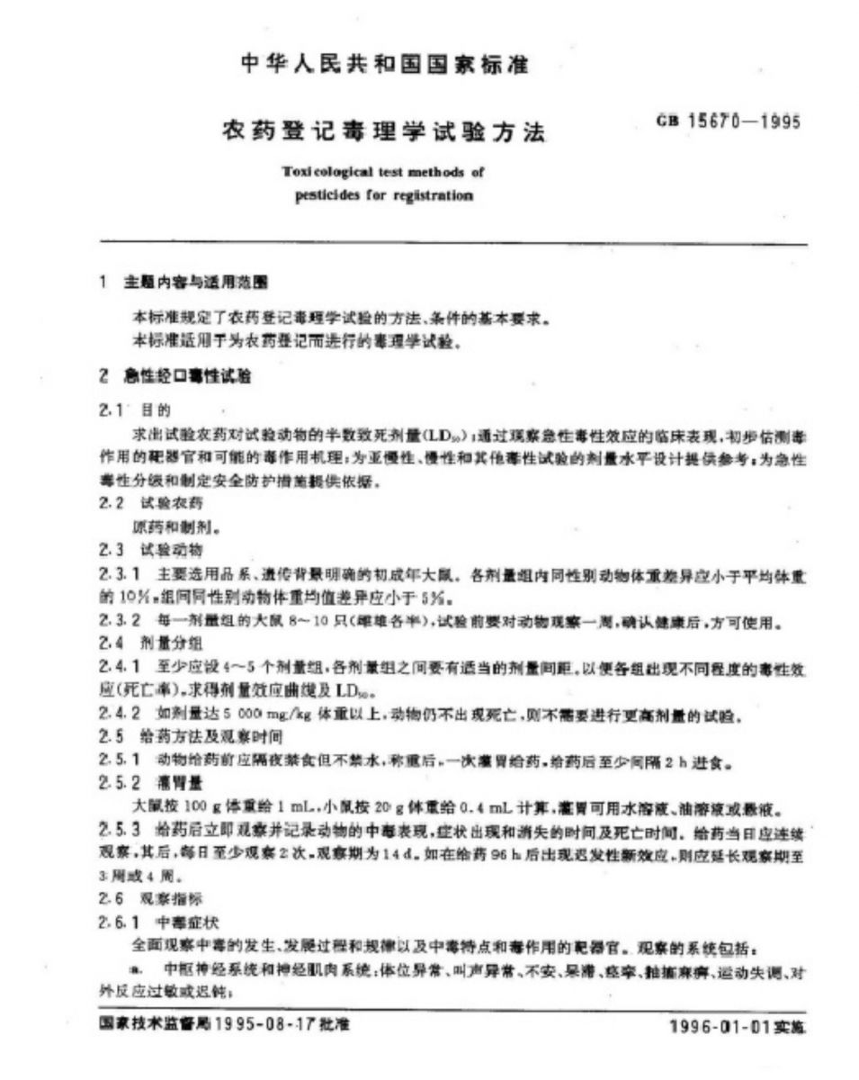 GB 15670-1995 農(nóng)藥登記毒理學試驗方法