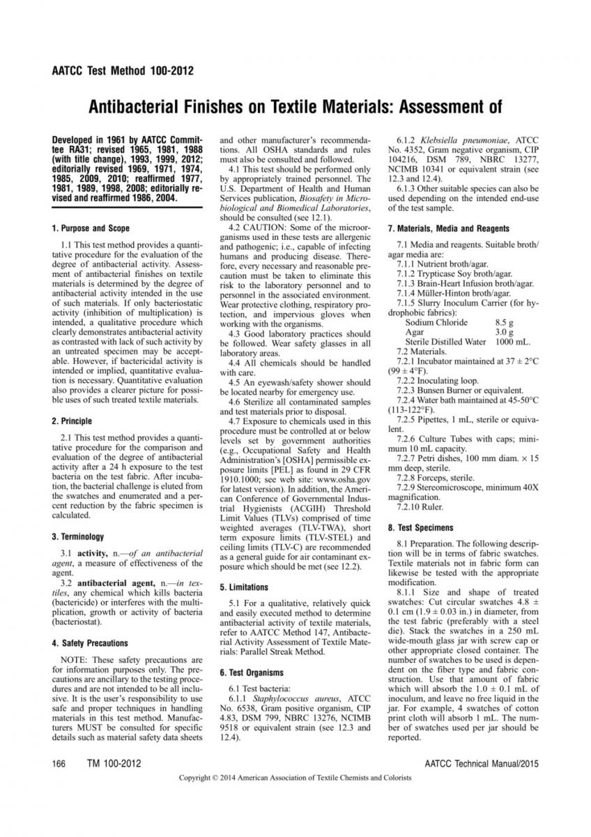 AATCC 100-2012 紡織材料的抗菌性能評價
