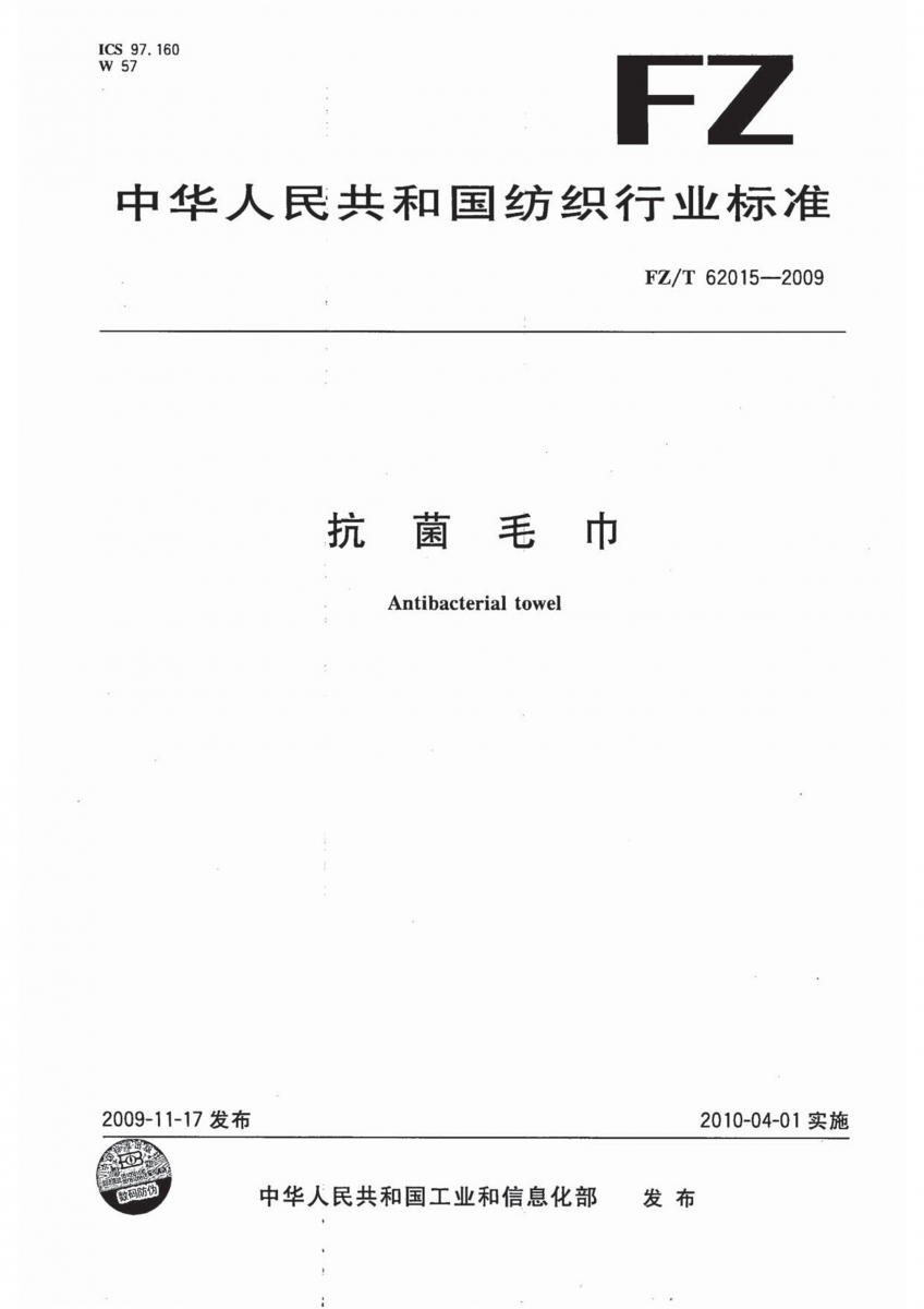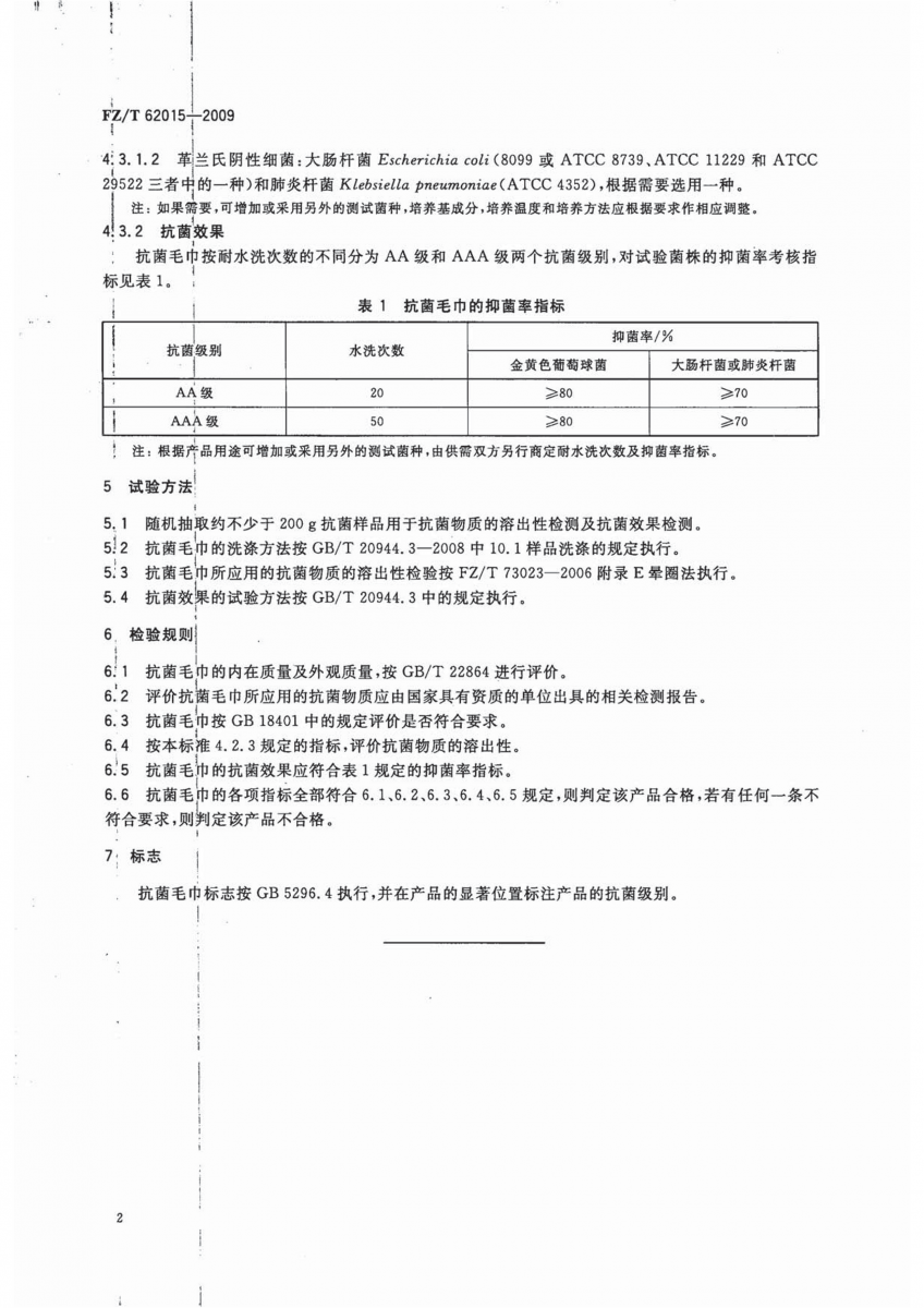 FZ/T 62015-2009 抗菌毛巾