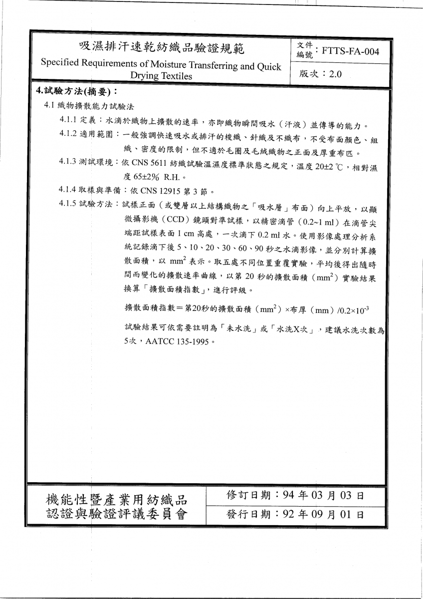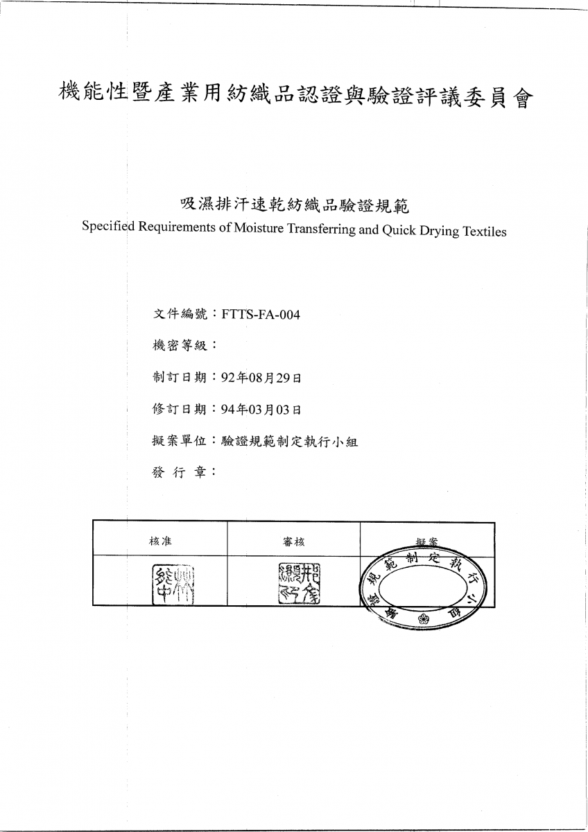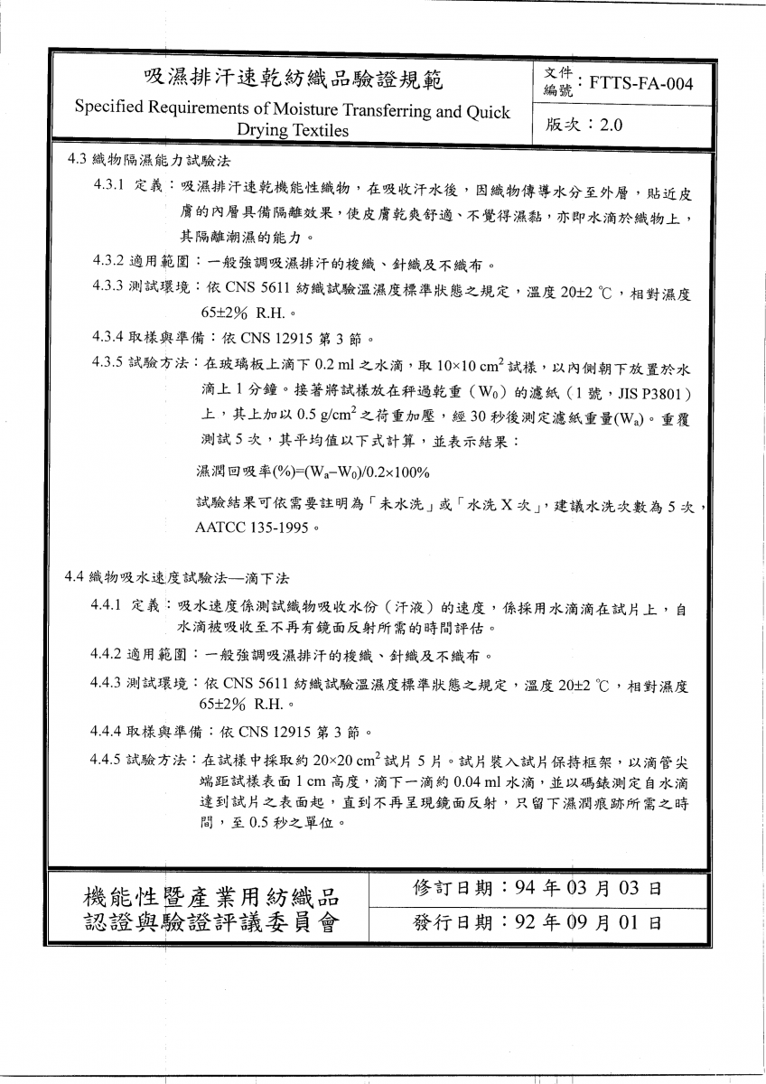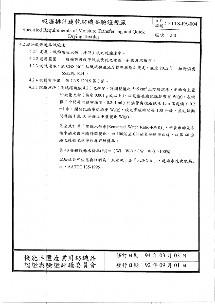 FTTS-FA-004 吸濕排汗速乾紡織品驗(yàn)證規(guī)範(fàn)