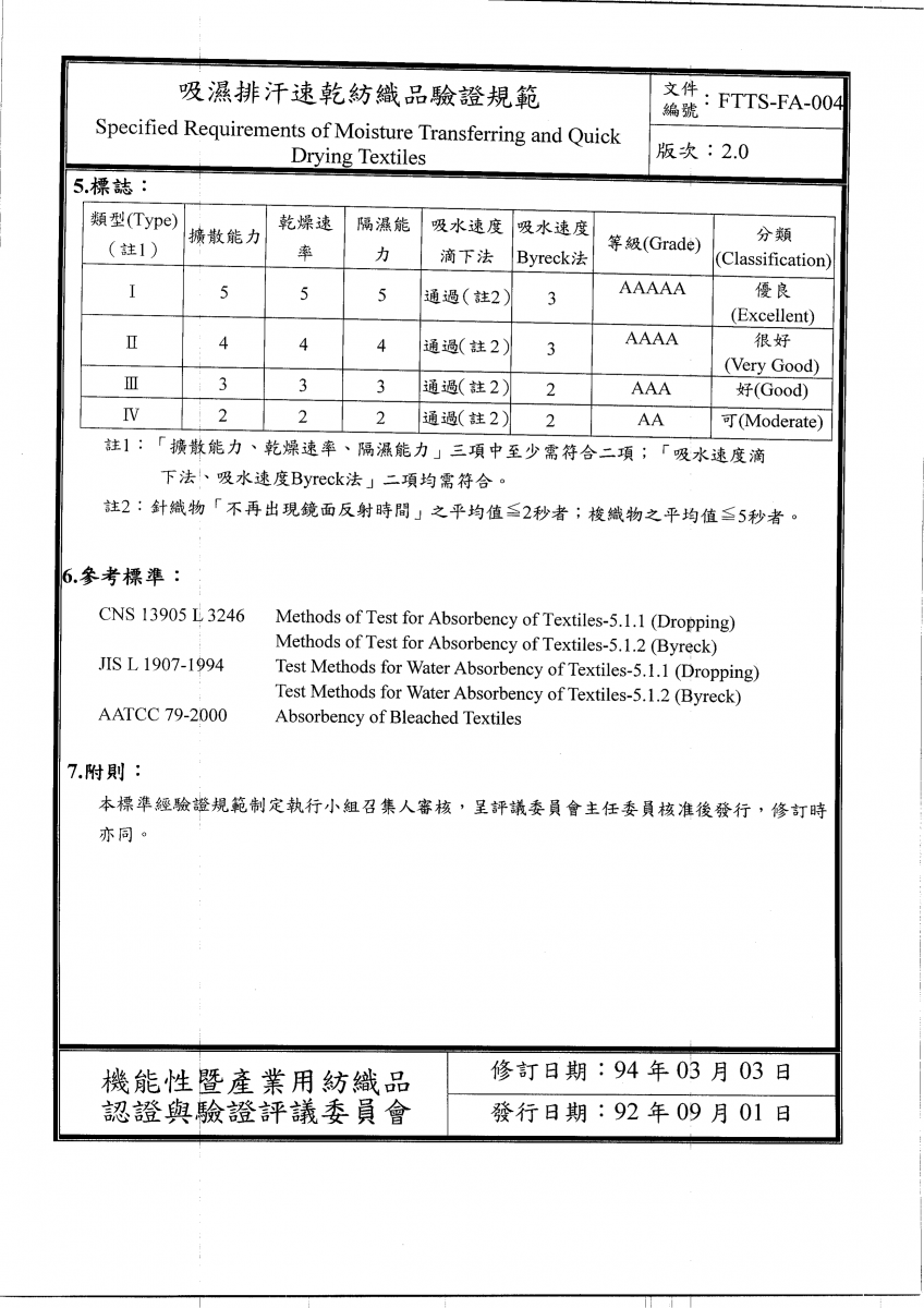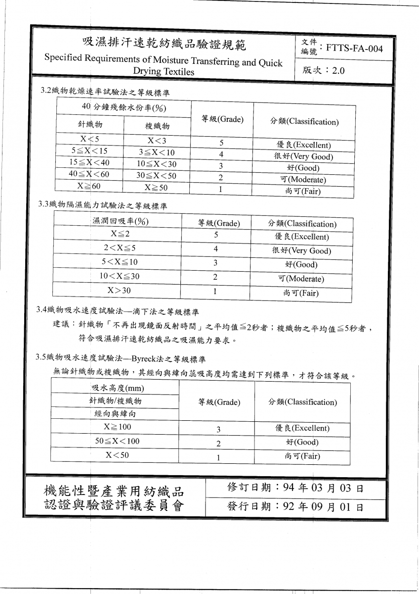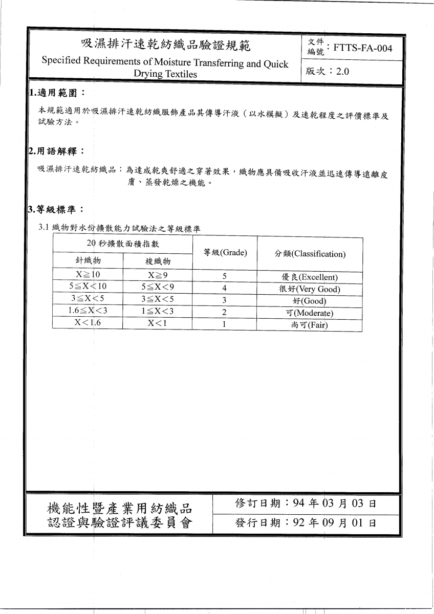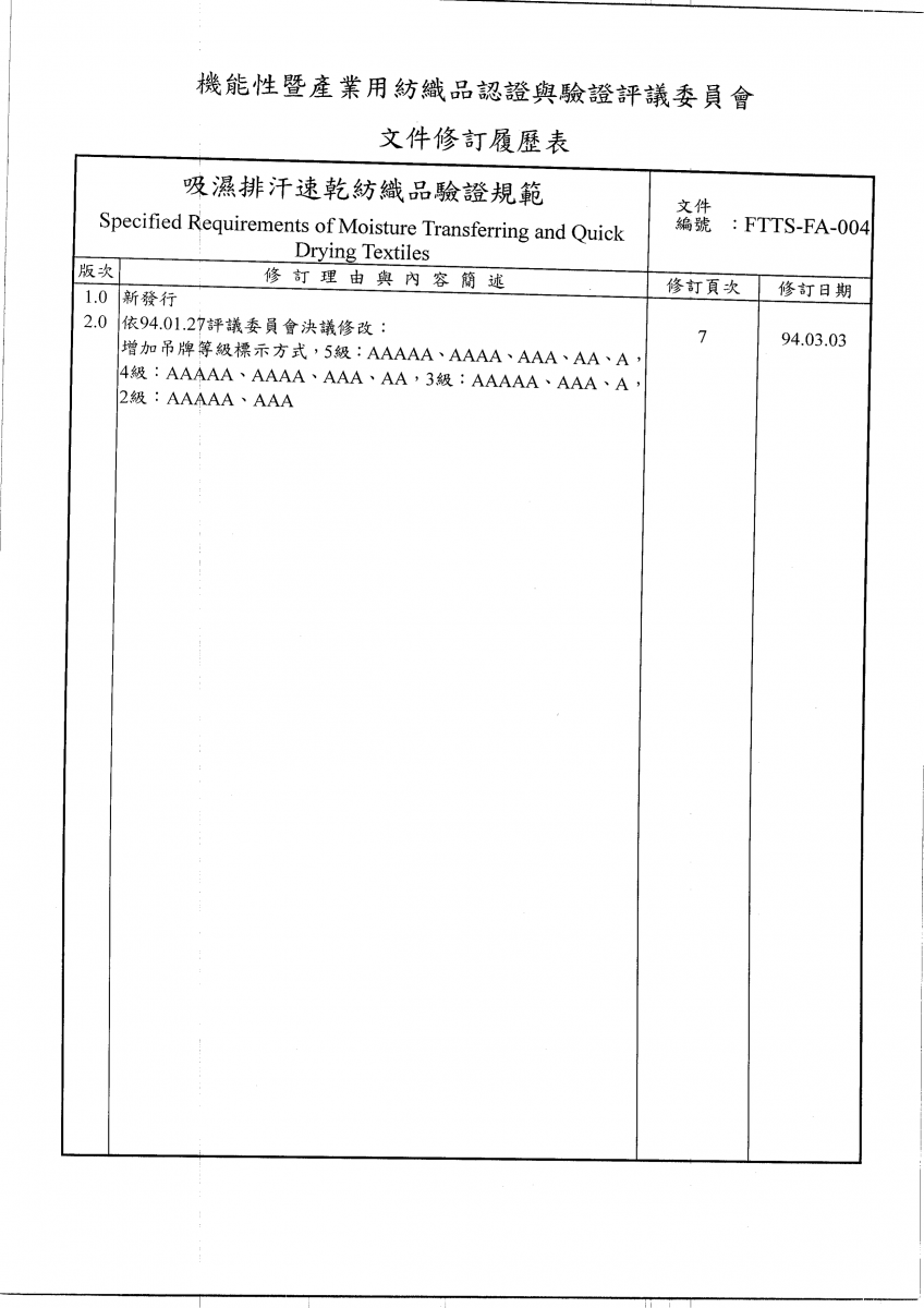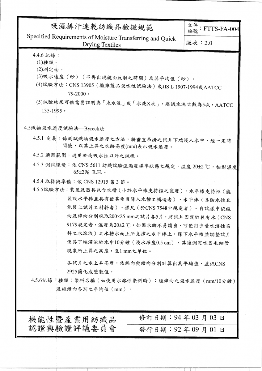 FTTS-FA-004 吸濕排汗速乾紡織品驗(yàn)證規(guī)範(fàn)