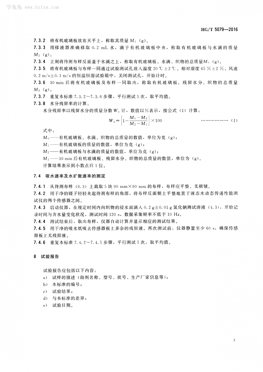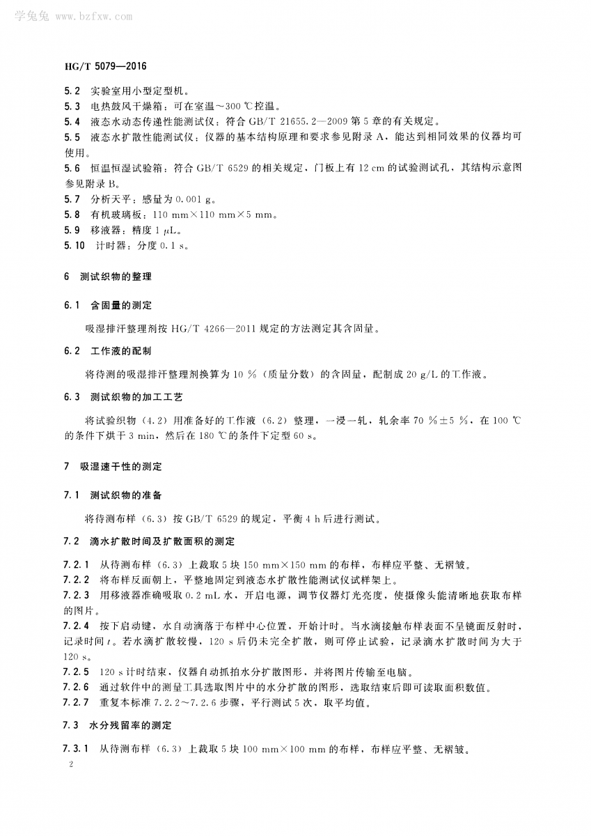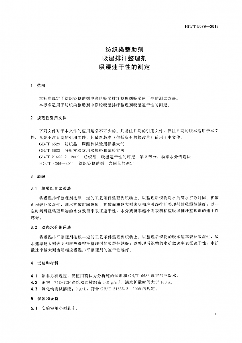 HG/T 5079-2016 紡織染整助劑 吸濕排汗整理劑 吸濕速干性的測定