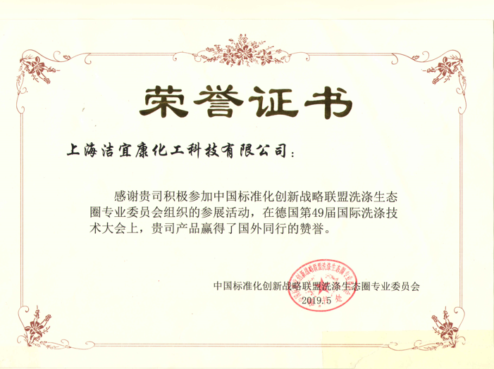 Certificate of honor awarded by China Standardization Innovation Strategic Alliance Wash Ecosphere Professional Committee