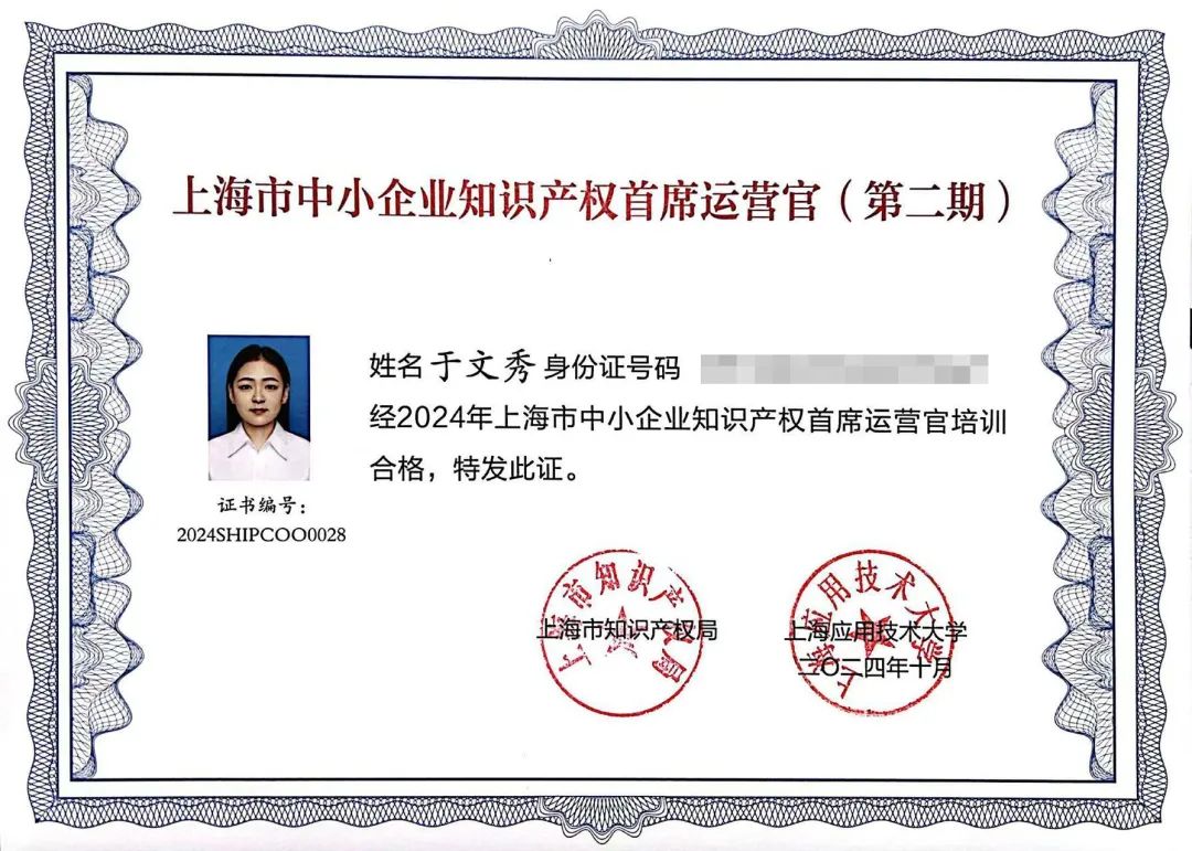 Ma Zhengsheng, the general manager of the company, Yu Wenxiu, the deputy director of the General office of the company, and Hu Yifan, the new force of the company, obtained the Shanghai Intellectual Property Worker certificate. Among them, Yu Wenxiu, the director of the General office of the company, successfully passed the 2024 Shanghai SME Intellectual Property Chief Operating Officer Training Program. Officially obtained the "2024 Shanghai SME Intellectual Property Chief Operating Officer" qualification certification. This achievement not only marks a solid step forward in the field of intellectual property management and protection, but also demonstrates the tireless efforts and excellent strength of Jieyikang in personnel training, reserve and technological innovation.