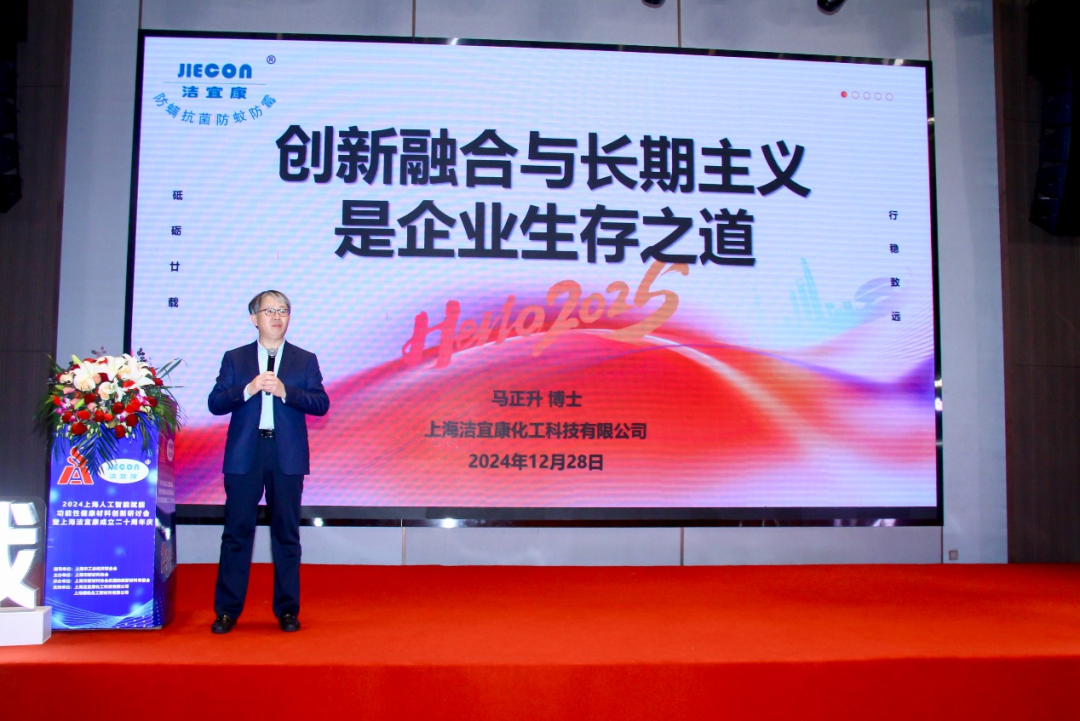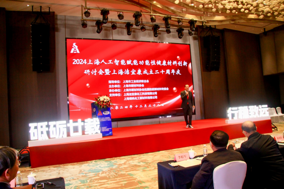 On the afternoon of December 28, 2024, Directed by Shanghai Federation of Industrial Economics, sponsored by Shanghai New Materials Association, sponsored by Shanghai New Materials Association Anti-bacterial and Anti-epidemic New Materials Committee, co-organized by Shanghai Jiecon Chemicals Hi-Tech Co., LTD and Shanghai Guofan Chemical New- Materials Co., LTD., "2024 Shanghai Artificial Intelligence Enabling Functional Health Materials Innovation Seminar" was successfully held in Shanghai Jiantao Novotel Hotel!