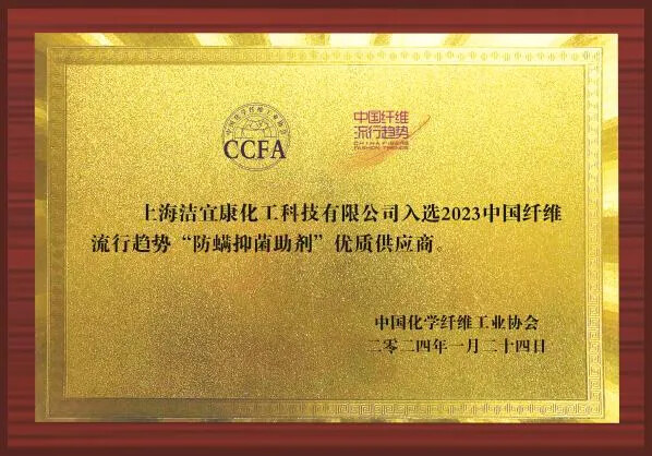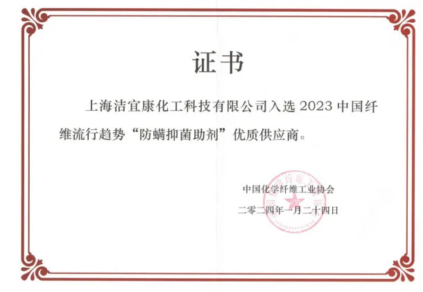 Shanghai Jiecon company was selected as the high-quality supplier of "Anti-mite and Anti-bacterial Additives" in China Fiber Trend in 2023.