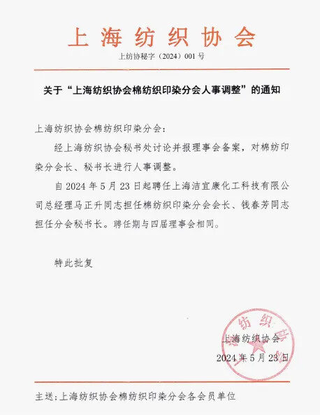 (1) Appointed as the President of the Cotton Textile Printing and Dyeing Branch of the Textile Association. After discussion by the secretariat of the Shanghai Textile Association and reported to the Council for the record, Mr. Ma Zhengsheng, general manager of Shanghai Jiecon Chemicals Hi-Tech Co., Ltd. was appointed as the president of the Cotton Textile Printing and Dyeing Branch from May 23, 2024.