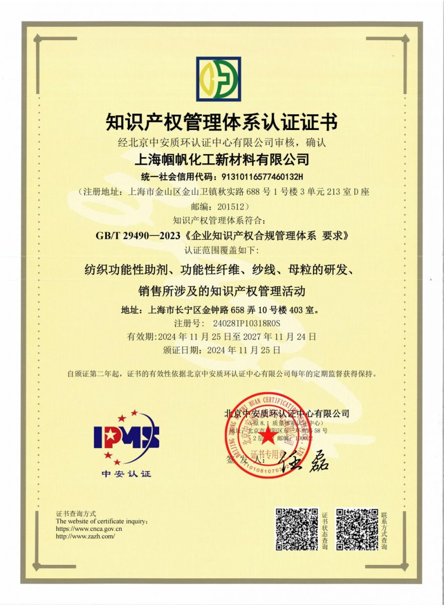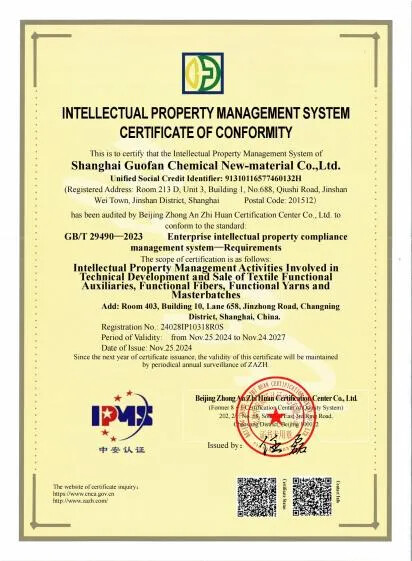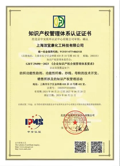 Shanghai Jiecon and Shanghai Guofan have passed the Intellectual Property Management System Certification, which proved that the technical strength and management level of the two companies in the field of textile new materials have reached a new height.