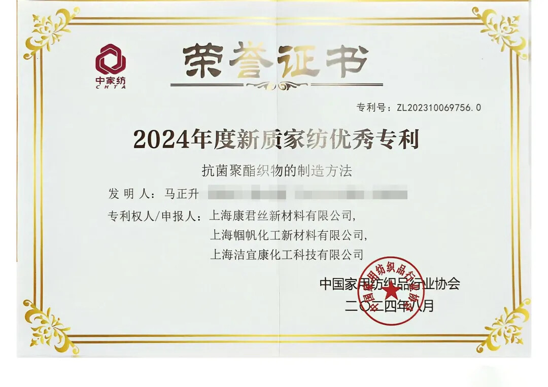 Among them, the invention patent jointly applied by Shanghai Jiecon, Shanghai Guofan and Shanghai Healthy Silk companies was recognized as the Excellent Patent of New Quality Home Textile in 2024 by China Home Textile Industry Association.