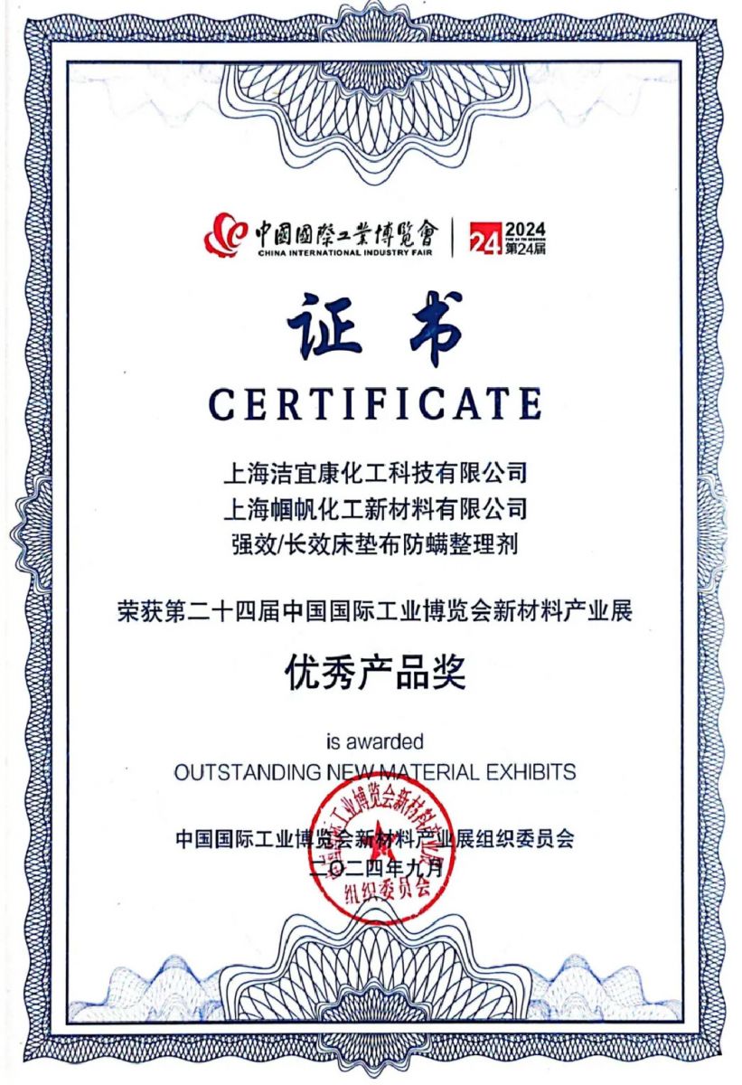 Shanghai Jiecon and Shanghai Guofan's high-quality product "Strong and Long-term Anti-mite Finishing Agent for Mattress Cloth" won the 24th China International Industry Expo New Material Industry Exhibition Excellent Product Award.