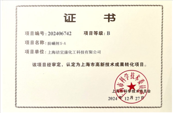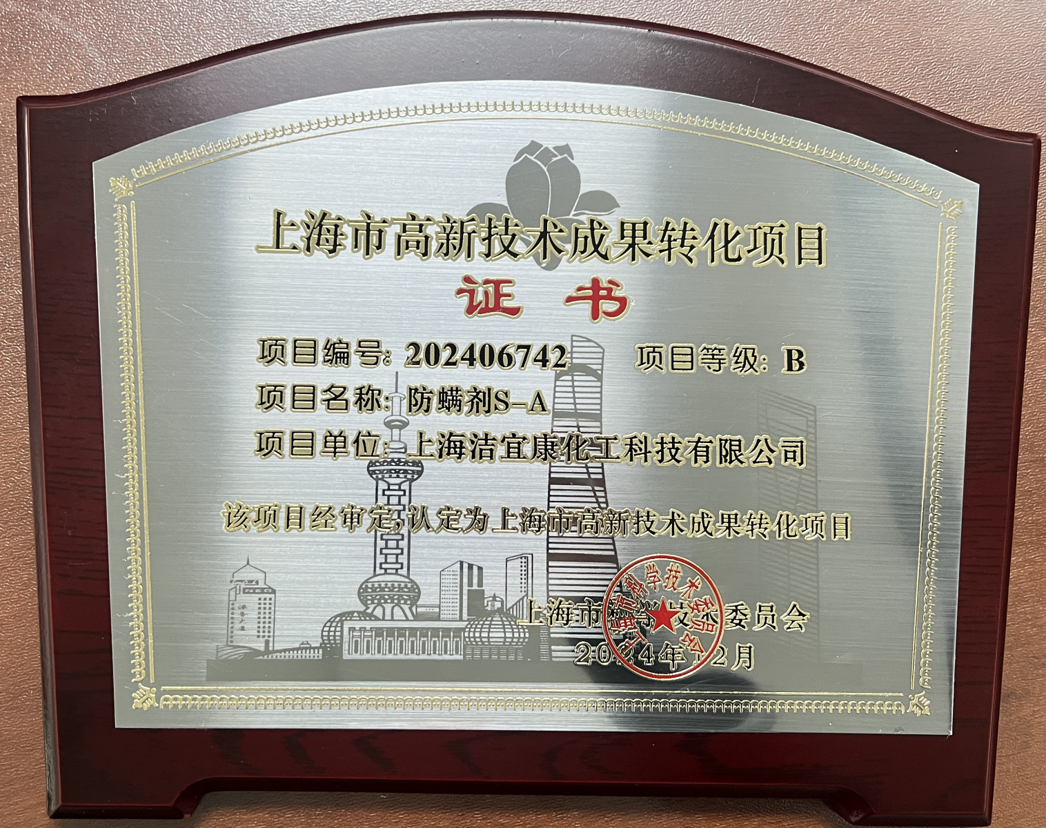 Shanghai Jiecon's superior patented product "Anti-mite Agent S-A" won the 2024 Shanghai High-tech Achievements transformation Project recognition.