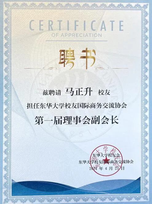 (7) Appointed as Vice president of the first Council of Donghua University Alumni International Business Exchange Association