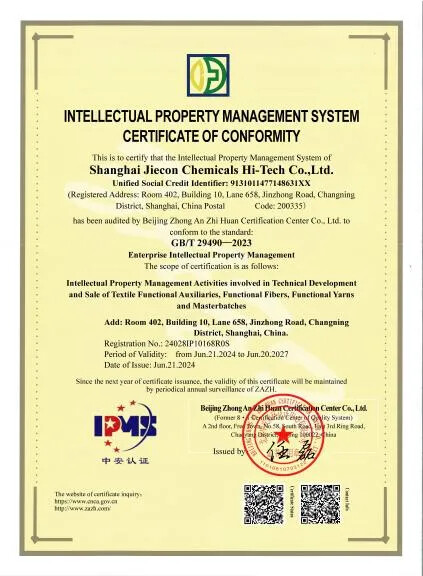 Shanghai Jiecon and Shanghai Guofan have passed the Intellectual Property Management System Certification, which proved that the technical strength and management level of the two companies in the field of textile new materials have reached a new height.