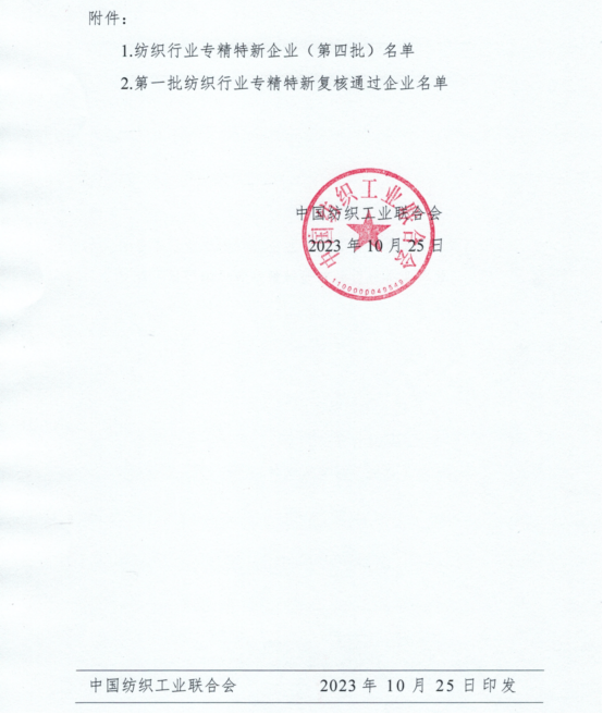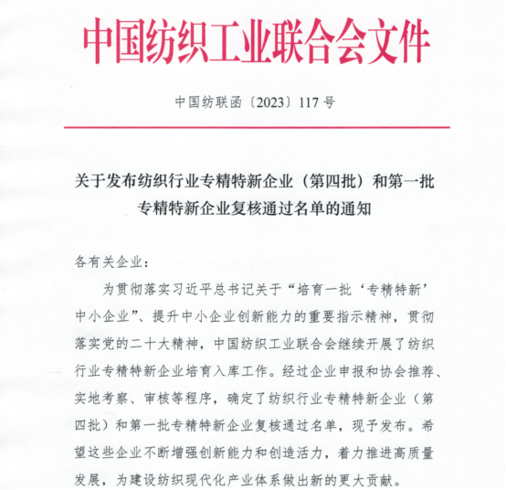 In order to implement the spirit of Xi Jinping,the General Secretary's important instructions on "cultivating a group of specialized and innovative small and medium-sized enterprises" and improving the innovation ability of small and medium-sized enterprises, and implement the spirit of the 20th Congress of the Communist Party of China, China National Textile Industry Federation continues to carry out the cultivation and warehousing of specialized and innovative enterprises in the textile industry.