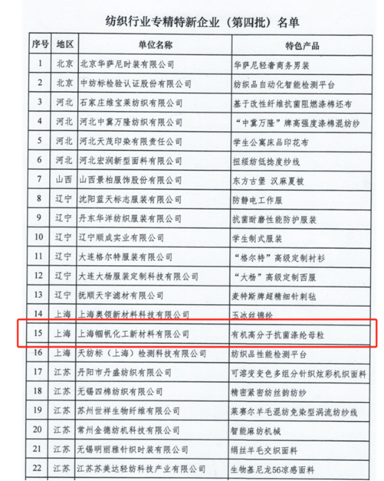 Recently, the China Textile Industry Federation released the textile industry specialized new enterprises (the fourth batch) and the first batch of specialized new enterprises through the review list, the company's cluster of enterprises - Shanghai Guofan Chemical New-material Co., Ltd. declared the fourth batch of textile industry specialized new enterprises in 2023, after examination and approval, inspection, Approved as a specialized new enterprise in the textile industry (the fourth batch); Featured product is "organic polymer antibacterial polyester masterbatch".