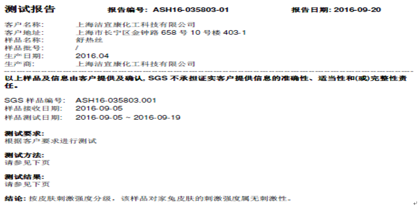 舒熱絲®繊維は安全性が高く、皮膚への刺激がありません。 SGS試験報告書は次のとおりです。